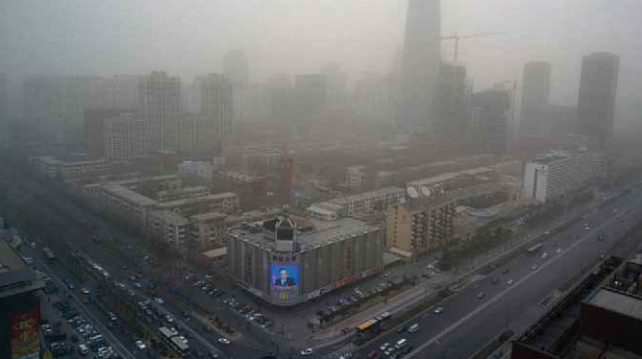 Рис. 1.4. Загрязнение городского воздуха. Серьезный случай загрязнения воздуха в Пекине, Китай, 18 марта 2008 года. Сжигание топлива на заводах, электростанциях и автотранспорте обеспечило большую долю загрязняющих веществ. Метеорологические факторы определяют, остаются ли загрязняющие вещества в городе или рассеиваются