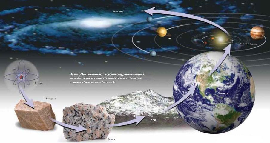 Рис. 1.5. От атомов до галактик. Науки о Земле изучают явления во многих различных масштабах