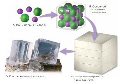 Рис. 2.2. Расположение ионов натрия и хлора в минерале галите. Расположение атомов (ионов) в виде базовых структурных элементов, имеющих кубическую форму, приводит к образованию кристаллов правильной кубической формы