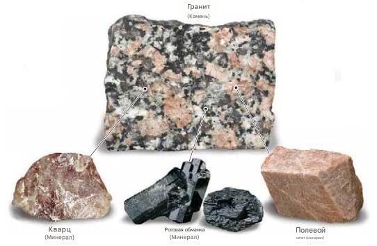 Рис. 2.3. Большинство горных пород представляют собой агрегаты минералов. На изображении показан образец магматической породы — гранита, а также три основных минерала, входящих в его состав