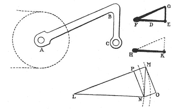 Если же представить, что то же усилие приложено непосредственно к концу прямого шатуна LN в точке N, то в горизонтальном положении рычага направление силы совпадёт с касательной, и оно используется полностью. Однако плечо рычага LN короче, чем у LM в ломаной конструкции. В итоге выигрыш в силе на длинном плече нивелируется её потерей из-за неоптимального направления приложения.