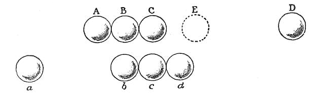 Рисунок 6. Схема начального (A, B, C, D) и конечного (a, b, c, d) положения системы бильярдных шаров после соударения. Шары B и C остаются на месте, шар A приходит в движение.