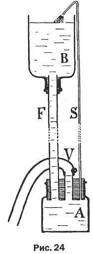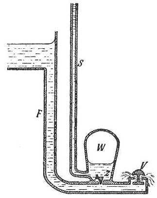 Рис. 24. Схема экспериментальной установки для демонстрации принципа гидравлического тарана. На рисунке изображены: резервуар (B), узкая трубка (S), резиновый рукав (V) с зажимом, сосуд (A) и тонкая трубка (F).