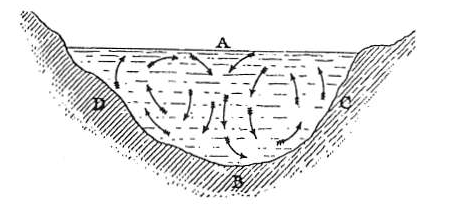 Процесс остывания воды в пруду или озере осенью и зимой происходит стадийно. Верхний слой (A), контактирующий с холодным воздухом, охлаждается, становится тяжелее и опускается вниз, вытесняя на поверхность более теплую и легкую воду (рис. 39). Так возникает вертикальная циркуляция, которая продолжается до тех пор, пока вся толща воды не достигнет температуры +4 °C. На дне (BCD) опустившаяся вода может незначительно нагреваться от грунта, но общий тренд ведет к выравниванию температуры.