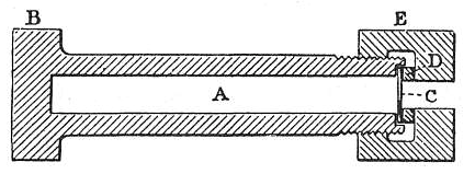 Рис. 40. Экспериментальная установка для демонстрации давления замерзающей воды: стальной цилиндр с полостью А, шестиугольной головкой В, медной пластинкой С, прижимным кольцом и запорной гайкой Е.