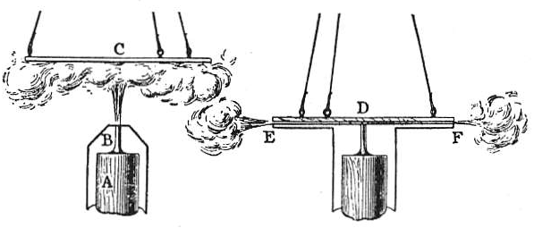 Для читателей, не имеющих возможности работать с паром, следует указать, что описанное явление можно воспроизвести с помощью струи воздуха. Для эксперимента необходимо изготовить два круглых диска диаметром около 15 сантиметров из тонкого дерева или плотного картона. В центре одного из них проделывается отверстие диаметром 4–5 миллиметров. Для подачи воздуха в это отверстие перпендикулярно плоскости диска крепится стеклянная трубка диаметром примерно 5 миллиметров. Удобнее всего это сделать, используя резиновую или корковую пробку с отверстием подходящего размера, которую затем приклеивают к пластине сургучом или клеем.