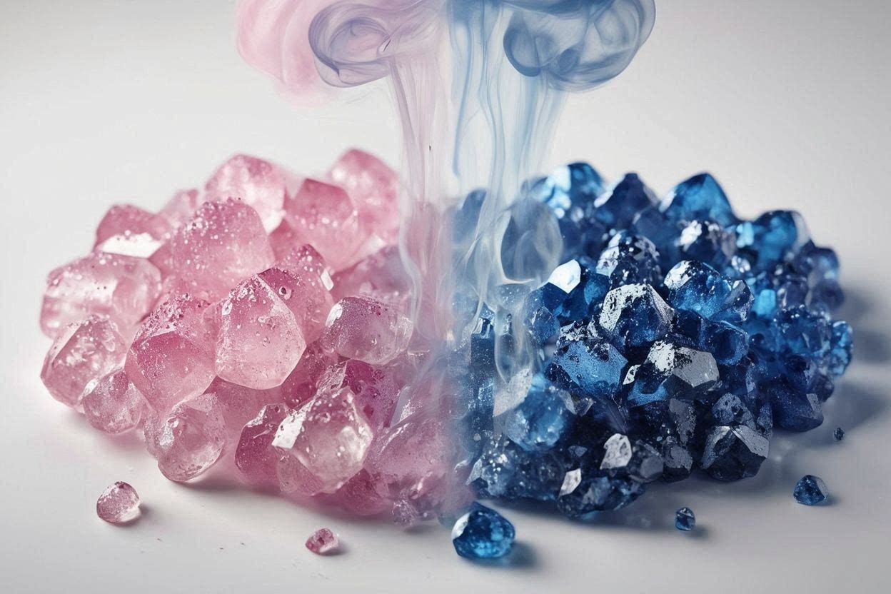 Рисунок 1. Изменение окраски хлорида кобальта при нагревании: красные гидратированные кристаллы переходят в синее безводное соединение с выделением водяного пара.