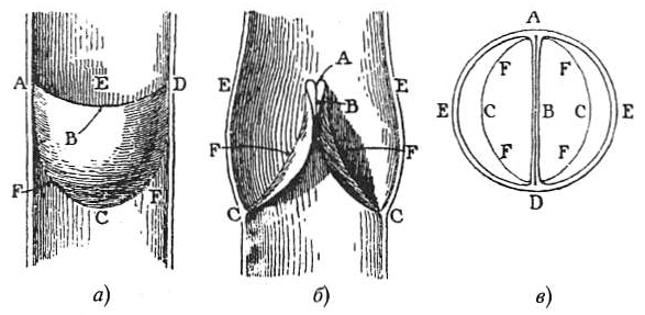 Данные анатомические структуры представляют собой парные карманообразные инвагинации внутренней оболочки вен, ориентированные в полость сосуда. На продольном разрезе вены (рис. 62а) визуализируется структура, где ABD обозначает свободный верхний край клапана, а ACD — край, фиксированный к сосудистой стенке. Рис. 62б демонстрирует вену в разрезе, рассекающем каждый клапан на две половины. В данном случае просвет вены расширен вследствие давления крови, которая заполняет карманы клапанов, прижимая их свободные края друг к другу и, таким образом, перекрывая путь в дистальный отдел.