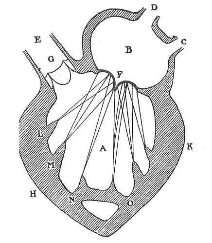 Рис. 63. Схема строения левой половины сердца с обозначением предсердия, желудочка, клапанного аппарата и сухожильных нитей (иллюстрация из первоисточника)