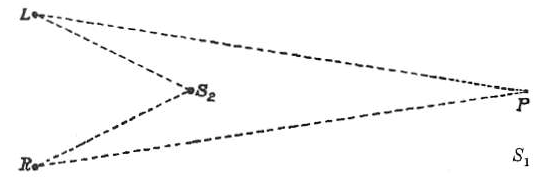 На рис. 68 представлена схема бинокулярного зрения, где R обозначает правый глаз, a L — левый глаз при рассмотрении сверху. При фиксации взгляда на точке P оба изображения проецируются на корреспондирующие точки сетчаток, а именно на область желтых пятен, что обеспечивает восприятие единого объекта. Для точки S1, расположенной в непосредственной близости от точки фиксации P, углы LS1R и LPR приблизительно равны, благодаря чему изображения S1 также попадают на симметричные участки сетчаток.