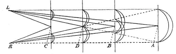 На рис. 69 представлена визуализация феномена диплопии при рассогласовании зрительных осей. Обозначения L и R соответствуют левому и правому глазу, а точки B, C и D демонстрируют различные варианты неправильной установки осей при наблюдении лунного серпа A. В зависимости от степени и характера девиации зрительных осей наблюдается либо полное разделение изображений (вариант C), либо их соприкосновение (D), либо частичное перекрытие проекций (B).