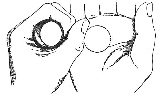 Рис. 70. Схема расположения рук при демонстрации оптической иллюзии, где круг обозначает область кажущегося отверстия в ладони