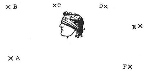 Результаты такого тестирования наглядно демонстрируют несостоятельность слухового анализатора в определении направления без участия когнитивных функций. Испытуемый не может сформировать достоверное суждение о месте возникновения звука. В лучшем случае его догадки носят случайный характер. Характерной ошибкой является указание на точку D, в то время как источник находится в A, или отнесение звука из точки F к позиции C. Это доказывает, что первичный сенсорный сигнал недостаточен для точной пространственной ориентации.