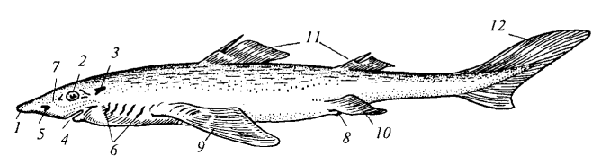 Рис. 12. Внешний вид колючей акулы (катрана): 1 — рыло; 2 — глаз; 3 — брызгальце; 4 — ротовая щель; 5 — ноздря; 6 — жаберные щели; 7 — отверстия каналов боковой линии; 8 — клоака; 9— грудной плавник; 10 — брюшной плавник; 11 — спинные плавники; 12 — хвостовой плавник