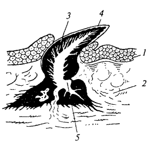 Рис. 13. Схематический разрез через кожу и плакоидную чешую акуловой рыбы: 1 — эпидермис; 2 — кориум; 3 — дентин; 4 — эмаль; 5 — внутренняя полость плакоидной чешуи