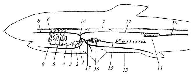 Рис. 15. Схема кровеносной системы акулы: 1 — венозная пазуха; 2 — предсердие; 3 — желудочек; 4 — артериальный конус; 5— брюшная аорта; 6 — выносящие жаберные артерии; 7 — спинная аорта; 8 — передняя кардинальная вена; 9 — нижняя яремная вена; 10 — хвостовая вена; 11 — воротная система почек; 12 — задняя кардинальная вена; 13 — боковая вена; 14 — кювьеров проток; 15 — воротная вена печени; 16 — воротная система печени; 17 — печеночная вена
