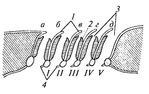 Рис. 16. Схема жаберного аппарата акулы: 1 — жаберная перегородка; 2 — жаберные лепестки; 3 — жаберная щель; 4 — жаберные тычинки; I— V— жаберные дуги; а — первая полужабра; б; в; г; д — целые жабры