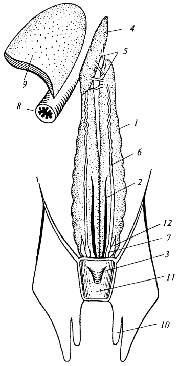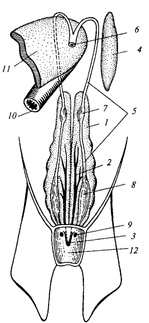 Рис. 17. Схема мочеполовой системы самца акулы: 1 — почка; 2 — мочеточник; 3 — мочеполовой сосочек; 4 — левый семенник; 5 — семявыносящие канальцы; 6 — семяпровод; 7 — семенной пузырек; 8 — пишевод; 9 — печень; 10— копулятивный отросток; 11 — полость клоаки; 12 — семенной мешок