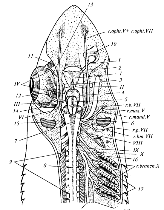 Система головных нервов акулы. Характер отхождения головных (черепных) нервов у акуловых рыб является типичным для всех позвоночных животных и служит важным систематическим признаком. От головного мозга акулы симметрично с обеих сторон отходят десять пар черепных нервов, каждая из которых имеет двойное обозначение: порядковый номер римскими цифрами и анатомическое название. Эта система иннервации обеспечивает чувствительную и двигательную связь мозга со всеми органами и тканями головы и части туловища. Изучение топографии черепных нервов имеет фундаментальное значение для понимания эволюции нервной системы позвоночных.