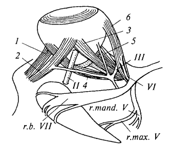 Рис. 27. Глазные мышцы акулы и иннервирующие их нервы на нижней стороне левого глаза (глаз отогнут вверх): 1 — верхняя косая мышца глаза; 2 — нижняя косая мышца; 3 — нижняя прямая мышца глаза; 4 — внутренняя прямая мышца; 5 — верхняя прямая мышца; 6 — наружная прямая мышца; II — зрительный нерв; III — глазодвигательный нерв; r.mand.V — нижнечелюстная ветвь тройничного нерва; r.max.V — верхнечелюстная ветвь тройничного нерва; VI — отводящий нерв; r.b.VII — щечная ветвь лицевого нерва