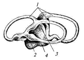 Рис. 28. Схема перепончатого лабиринта акулы: 1 — полукружные каналы; 2 — круглый мешочек; 3 — овальный мешочек; 4 — лагена