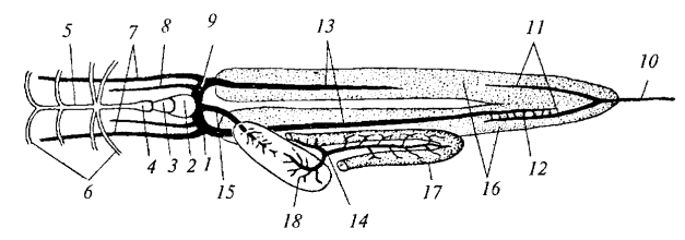 Рис. 30. Схема кровеносной системы костистой рыбы (вид снизу; не показаны выносящие жаберные артерии; их слияние в спинную аорту и ветвление последней): 1 — венозная пазуха; 2 — предсердие; 3 — желудочек; 4 — луковица аорты; 5 — брюшная аорта; 6 — приносящие жаберные артерии; 7 — передние кардинальные вены; 8— нижняя яремная вена; 9 — кювьеров проток; 10— хвостовая вена; 11 — воротные вены почек; 12 — анастомозы между воротной веной правой почки и правой задней кардинальной веной; 13 — задние кардинальные вены; 14 — воротная вена печени; 15 — печеночная вена; 16 — почки; 17 — кишечник; 18 — печень