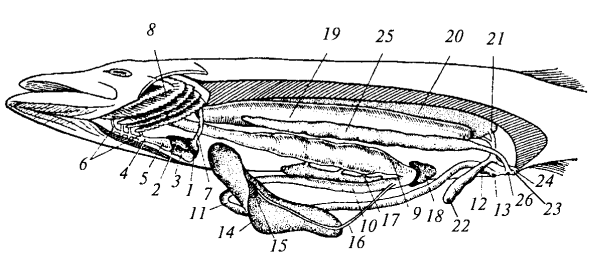 Рис. 31. Общее расположение внутренних органов щуки: 1 — венозный синус; 2 — предсердие; 3 — желудочек сердца; 4 — брюшная аорта; 5 — луковица аорты; 6 — приносящие жаберные артерии; 7 — кювьеров проток; 8— жабра; 9 — желудок; 10 — двенадцатиперстная кишка; 11 — тонкая кишка; 12 — прямая кишка; 13 — анальное отверстие; 14 — печень; 15 — желчный пузырь; 16 — желчный проток; 17— поджелудочная железа; 18— селезенка; 19— плавательный пузырь; 20 — почка; 21 — мочеточник; 22 — мочевой пузырь; 23 — мочеполовой сосочек; 24 — мочевое отверстие; 25 — половая железа; 26 — половое отверстие