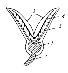 Рис. 32. Схема поперечного разреза жабры костистой рыбы: 1 — жаберная дуга; 2 — жаберная тычинка; 3 — жаберные лепестки; 4— приносящая жаберная артерия; 5 — выносящая жаберная артерия