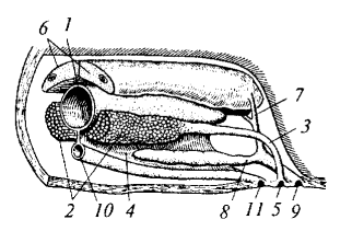 Рис. 29. Внешний вид щуки: 1 — жаберная крышка; 2 — ноздря; 3 — боковая линия; 4 — грудные плавники; 5 — брюшные плавники; 6 — анальное отверстие; 7 — половое и мочевое отверстия; 8— хвостовой плавник; 9 —анальный плавник; 10 — спинной плавник; 11 — ротовое отверстие; 12 — свободный задний конец верхнечелюстной кости