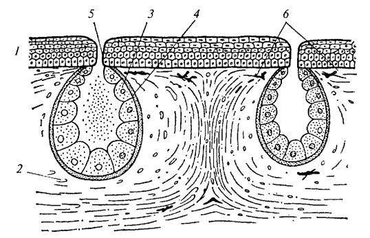 Рис. 43. Схема строения кожи лягушки (разрез): 1 — эпидермис; 2 — кориум; 3 — секреторные клетки кожной железы; 4— мускульный покров железы; 5 — выводной проток кожной железы; 6— пигментные клетки