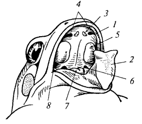 Рис. 44. Ротовая полость лягушки: 1 — зубы; 2— язык; 3— сошник с сошниковыми зубами; 4— хоаны; 5— просвечивающее глазное яблоко; 6— отверстие евстахиевой трубы; 7 — гортань; 8 — отверстие резонатора
