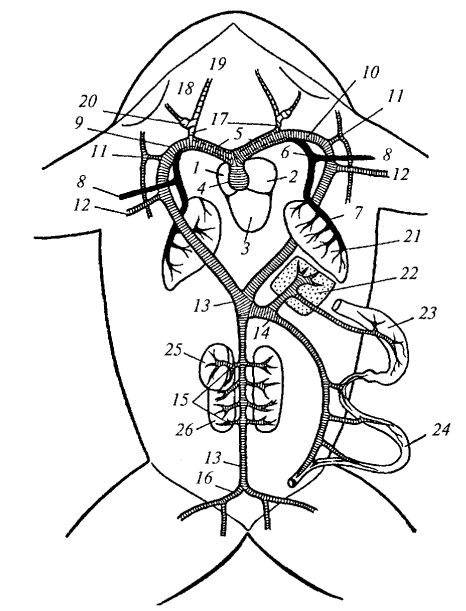 Рис. 46. Артериальная система лягушки. Артериальная кровь показана редкой штриховкой; смешанная — густой штриховкой; венозная — черным цветом: 1 — правое предсердие; 2 — левое предсердие; 3 — желудочек; 4 — артериальный конус; 5 — общий артериальный ствол; 6 — кожно-легочная артерия; 7 — легочная артерия; 8 — большая кожная артерия; 9 — правая дуга аорты; 10 — левая дуга аорты; 11 — затылочно-позвоночная артерия; 12 — подключичная артерия; 13 — спинная аорта; 14 — кишечно-брыжеечная артерия; 15 — мочеполовые артерии; 16— общая подвздошная артерия; 17 — общая сонная артерия; 18 — внутренняя сонная артерия; 19— наружная сонная артерия; 20 — сонная «железа»; 21 — легкое; 22 — печень; 23 — желудок; 24 — кишечник; 25 — семенник; 26 — почка