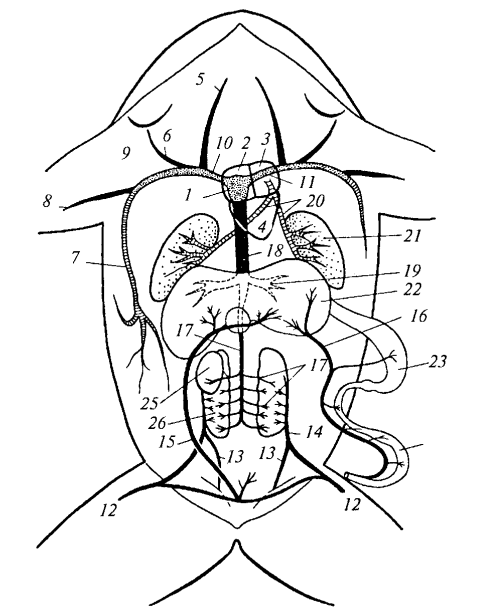 Кровеносная система: сердце и артериальные дуги. В верхней части препарата в перикардиальной полости лежит сердце, окруженное тонкой околосердечной сумкой; после ее вскрытия становятся видны отделы сердца (рис. 46, 47, 48). Под сердцем находится тонкостенная венозная пазуха, образованная слиянием трех крупных вен. Выше располагаются два предсердия — правое (более крупное, принимающее венозную пазуху) и левое (принимающее легочные вены), а заднюю конусовидную часть составляет мускулистый желудочек. От правой стороны желудочка отходит артериальный конус, дающий начало трем парам артериальных дуг, которые вначале идут вместе в общем артериальном стволе. Первыми отходят парные кожно-легочные артерии (гомологи IV пары жаберных дуг рыб), которые вскоре разделяются на легочные артерии к легким и крупные кожные артерии к коже спины.