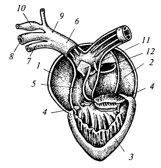 Рис. 48. Схема вскрытого сердца лягушки: 1 — правое предсердие; 2 — левое предсердие; 3 — желудочек; 4 — клапаны, закрывающие общее отверстие, ведущее из обоих предсердий в желудочек; 5 — артериальный конус; 6 — общий артериальный ствол; 7 — кожно-легочная артерия; 8— дуга аорты; 9— общая сонная артерия; 10 — сонная «железа»; 11 — спиральный клапан артериального конуса; 12 — выход из венозной пазухи в правое предсердие