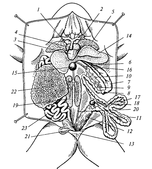 Рис. 49. Общее расположение внутренних органов самки лягушки: 1 — правое предсердие; 2 — левое предсердие; 3 — желудочек; 4 — артериальный конус; 5 —легкое; 6 — пищевод; 7— желудок; 8— пилорическая часть желудка; 9— двенадцатиперстная кишка; 10— поджелудочная железа; 11 — тонкая кишка; 12 — прямая кишка; 13 — область клоаки; 14 — печень; 15 — желчный пузырь; 16 — желчный проток; 17 — брыжейка; 18 — селезенка; 19 — почка; 20 — мочеточник; 21 — мочевой пузырь; 22 — яичник; 23 — яйцевод (левые яичник и яйцевод на рисунке не изображены)