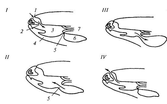 Рис. 50. Схема механизма дыхания лягушки: I— ротовая полость расширяется и в нее поступает воздух через открытые ноздри; II — ноздри закрываются; открывается гортанная щель; и выходящий из легких воздух смешивается в ротовой полости с атмосферным воздухом; III — ноздри закрыты; ротовая полость сокращается; и смешанный воздух нагнетается в легкие; IV— гортанная щель закрыта; дно ротовой полости прижимается к нёбу, выталкивая остатки воздуха наружу через открывшиеся ноздри: 1 — наружное отверстие ноздри; 2 — внутреннее отверстие ноздри (хоана); 3 — ротовая полость; 4 — дно ротовой полости; 5 — гортанная щель; 6 — легкое; 7 — пищевод