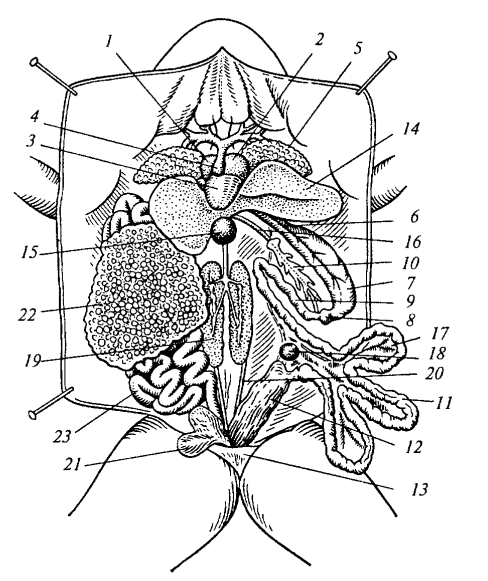Крупным компактным органом является трехлопастная печень (hepar; рис. 49, 14), лежащая непосредственно за сердцем. На вентральной поверхности её средней доли расположен округлый желчный пузырь (vesica fellea; рис. 49, 15) зеленовато-черного цвета, служащий резервуаром для желчи. Печеночные протоки, сливаясь с протоком желчного пузыря, формируют общий желчный проток (ductus choledochus; рис. 49, 16), который проходит через ткань поджелудочной железы и впадает в начальный отдел двенадцатиперстной кишки.