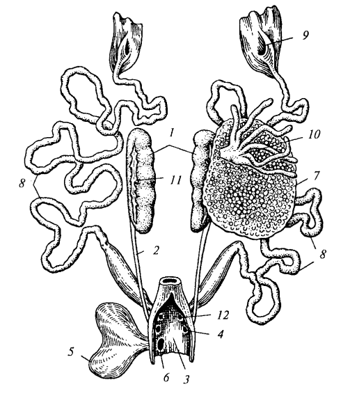 В период размножения в стенках вольфовых каналов образуются семенные пузырьки (vesicula seminalis; рис. 51, 9) — расширения для хранения семенной жидкости. Парные яичники (ovarium; рис. 52, 7) самок представляют собой тонкостенные мешки, заполненные пигментированными яйцами, которые просвечивают через стенки.
