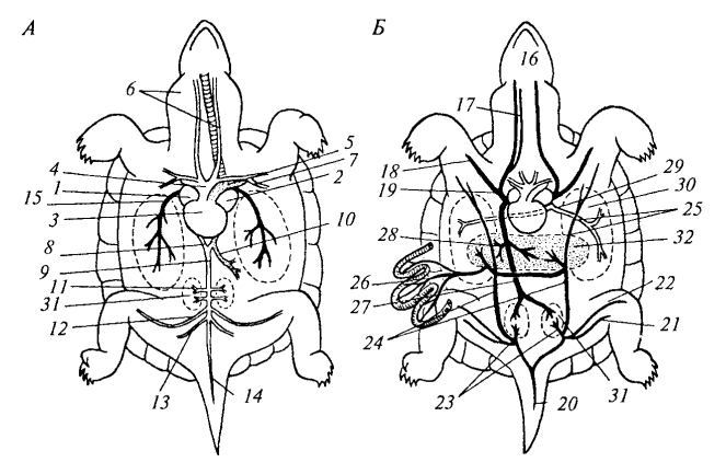 Рис. 77. Схема кровеносной системы болотной черепахи: А — артериальная система; Б — венозная система (белым цветом показаны артерии с артериальной кровью; точками — со смешанной кровью и черным цветом — артерии и вены с венозной кровью): 1 — правое предсердие; 2 — левое предсердие; 3 — желудочек; 4 — правая дуга аорты; 5 — левая дуга аорты; 6 — общая сонная артерия; 7 — подключичная артерия; 8 — слияние правой и левой дуг аорты в спинную аорту; 9 — спинная аорта; 10 — артерии, идущие к желудку и кишечнику; 11 — почечные артерии; 12 — подвздошная артерия; 13 — седалищная артерия; 14— хвостовая артерия; 15 — легочная артерия; 16— яремная вена; 17 — наружная яремная вена; 18 — подключичная вена; 19 — правая передняя полая вена; 20 — хвостовая вена; 21 — седалищная вена; 22 — подвздошная вена; 23 — воротная вена почки; 24 — брюшная вена; 25 — передняя брюшная вена; 26 — вены, идущие от желудка и кишечника; 27 — задняя полая вена; 28 — печеночная вена; 29 — легочная вена; 30 — легкое; 31 — почка; 32 — печень