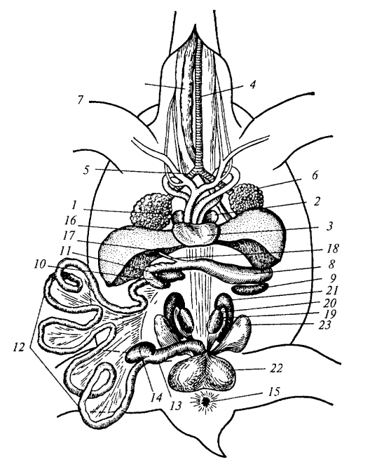 Рис. 78. Общее расположение внутренних органов самца болотной черепахи: 1 — правое предсердие; 2 — левое предсердие; 3 — желудочек; 4 — трахея; 5 — бронх; 6 — легкое; 7—пищевод; 8 —желудок; 9 — селезенка; 10 — двенадцатиперстная кишка; 11 — поджелудочная железа; 12 — тонкая кишка; 13 — толстая кишка; 14 — слепой вырост кишки; 15 — наружное отверстие клоаки; 16 — печень; 17— желчный пузырь; 18 — желчный проток