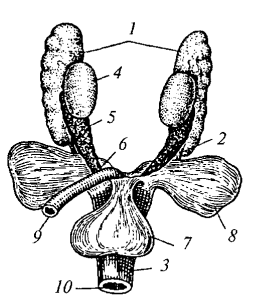 Рис. 79. Мочеполовая система самца болотной черепахи: 1 — почка; 2 — мочеточник; 3 — клоака; 4 — семенник; 5 — придаток семенника; 6 — семяпровод; 7 — мочевой пузырь; 8— анальный мешок; 9 — прямая кишка; 10 — наружное отверстие клоаки