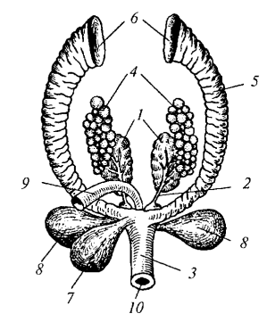 Рис. 80. Мочеполовая система самки болотной черепахи: 1 — почка; 2 — мочеточник; 3 — клоака; 4 — яичник; 5 — яйцевод; 6 — воронка яйцевода; 7 — мочевой пузырь; 8 — анальный мешок; 9 — прямая кишка; 10 — наружное отверстие клоаки