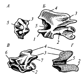 Рис. 81. Позвонки варана: А — атлант; Б — эпистрофей; В — грудной позвонок; Г— продольный разрез грудного позвонка: 1 — зубовидный отросток эпистрофея; 2 — тело позвонка; 3— верхняя дуга; 4— остистый отросток; 5 — канал для спинного мозга; 6 — передний сочленовный отросток; 7— задний сочленовный отросток