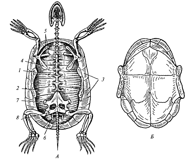 Рис. 82. Скелет болотной черепахи: А — карапакс; Б — пластрон: 1 — туловищный отдел позвоночного столба; 2 — реберные пластинки; 3— краевые пластинки; 4 — коракоид; 5 — лопатка; 6 — подвздошная кость; 7 — лобковая кость; 8 — седалищная кость