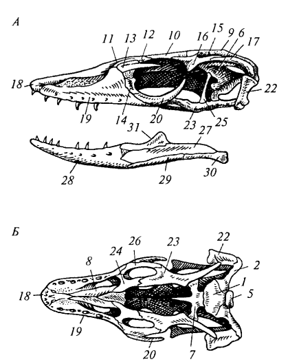 Височные дуги и типы черепа. У рептилий в связи с редукцией сплошного костного панциря (стегального черепа) формируются височные ямы и ограничивающие их височные дуги. По количеству дуг различают несколько типов черепа. Диапсидный (двудужный) череп характерен для крокодилов, ящериц и змей, но степень развития дуг варьирует. У крокодила (рис. 84) имеются две полные височные дуги: верхняя (из заглазничной и чешуйчатой костей) и нижняя (из скуловой и квадратно-скуловой костей). У варана нижняя дуга редуцирована (отсутствует квадратно-скуловая кость), поэтому боковая височная яма остается открытой. У змей (рис. 86) редуцированы обе дуги, что обеспечивает чрезвычайную подвижность челюстного аппарата.