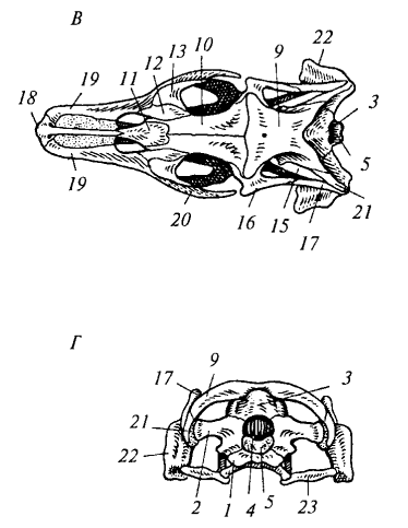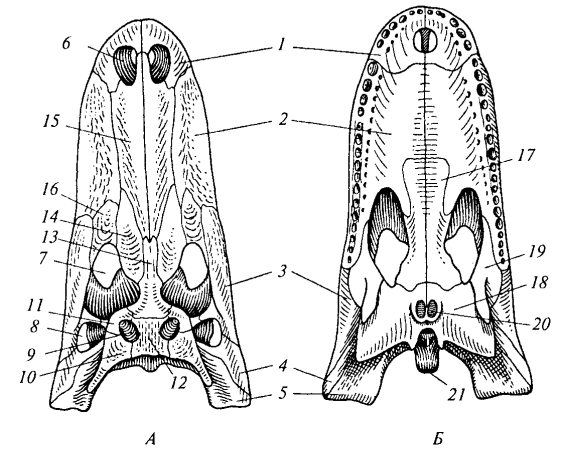 Рис. 84. Череп крокодила (миссисипский аллигатор): А — сверху; Б — снизу: 1 — предчелюстная кость; 2 — верхнечелюстная кость; 3 — скуловая кость; 4 — квадратно-скуловая кость; 5 — квадратная кость; 6 — наружная ноздря; 7 — глазница; 8 — боковая височная яма; 9 — верхняя височная яма; 10 — чешуйчатая кость; 11 — заглазничная кость; 12 — теменная кость; 13 — лобная кость; 14 — предлобная кость; 15 — носовая кость; 16 — слезная кость; 17— нёбная кость; 18 — крыловидная кость; 19 — поперечная кость; 20— хоаны; 21 — затылочный мыщелок