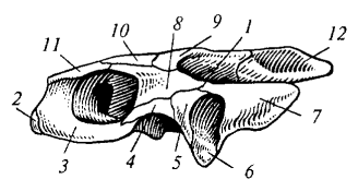 Рис. 85. Череп болотной черепахи: 1 — ложная височная яма; 2 — предчелюстная кость; 3 — верхнечелюстная кость; 4 — скуловая кость; 5 — квадратно-скуловая кость; 6 — квадратная кость; 7 — чешуйчатая кость; 8 — заглазничная кость; 9 — теменная кость; 10 — лобная кость; 11 — предлобная кость; 12 — верхняя затылочная кость