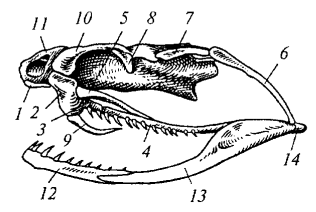 Рис. 86. Череп ядовитой змеи: 1 — предчелюстная кость; 2 — верхнечелюстная кость; 3 — нёбная кость; 4 — крыловидная кость; 5 — поперечная кость; б — квадратная кость; 7 — над- височная кость; 8— заднелобная кость; 9— ядовитый зуб; 10 — предлобная кость; 11 — носовая кость; 12— зубная кость; 13 — угловая кость; 14 — сочленовная кость
