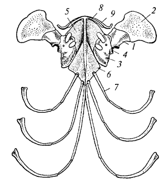 Рис. 87. Плечевой пояс варана (вид снизу): 1 — лопатка; 2 — надлопаточный хрящ; 3 — коракоид; 4 — суставная впадина для головки плеча; 5 — про- коракоидный хрящ; 6 — грудина; 7 — ребра; 8 — надгрудинник; 9 — ключица