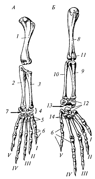 Рис. 89. Конечности варана: А — передняя; Б — задняя: 1 — плечевая кость; 2 — локтевая кость; 3 — лучевая кость; 4 — запястье; 5 — пясть; 6 — фаланга пальцев; 7— интеркар- пальный сустав; 8 — бедренная кость; 9 — большая берцовая кость; 10 — малая берцовая кость; 11— коленная чашечка; 12 — предплюсна; 13 — интертарзальный сустав; 14 — плюсна